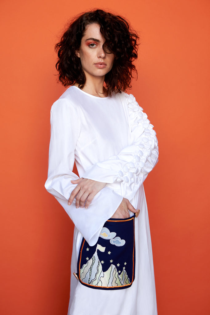 Round neck Dress which features buttoned flared sleeves with an embroidered patch pocket and a back button opening.